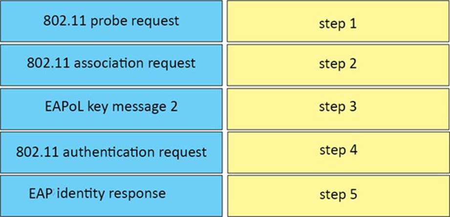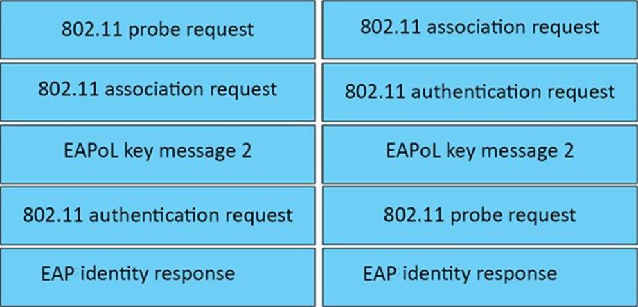 Consider the association process of a wireless client to an SSID. Drag and drop the client actions from left into the correct order of operation on the right.