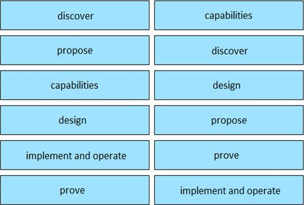 Drag and drop the process steps from the left into the correct order on the right as they are described in the “The Cisco Business Architecture methodology”.