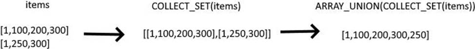 COLLECT SET is a kind of aggregate function that combines a column value from all rows into a unique list ARRAY_UNION combines and removes any duplicates,