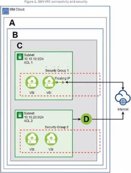 Which component is represented by letter D in the displayed IBM VPC connectivity and security diagram?