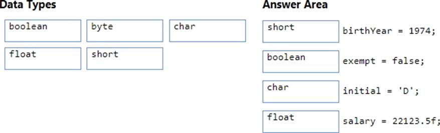 Which data type should you use to complete each variable declaration? To answer, drag the appropriate data type from the column on the left to its code segment on the right. Each data may be used once, more than once, or not at all. You may need to drag the split bar between panes or scroll to view content.