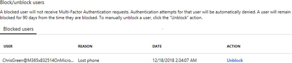 From the MFA Server blade, you open the Block/unblock users blade as shown in the exhibit.