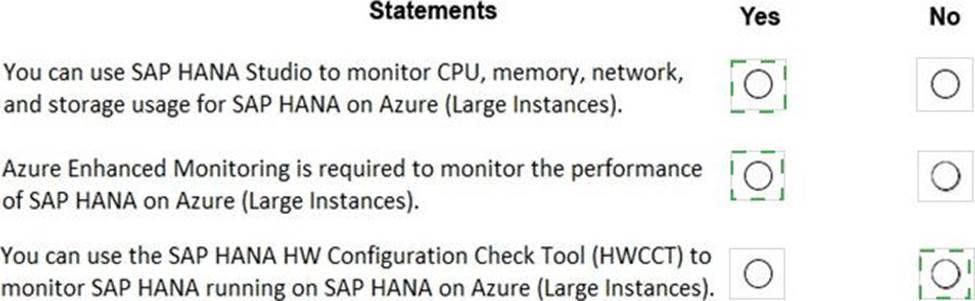 HOTSPOT You deploy SAP HANA by using SAP HANA on Azure (Large Instances). For each of the following statements, select Yes if the statement is true. Otherwise, select No. NOTE: Each correct selection is worth one point. View AnswerAnswer: Explanation: Box 1: Yes Box 2: Yes The SAP Azure Enhanced...