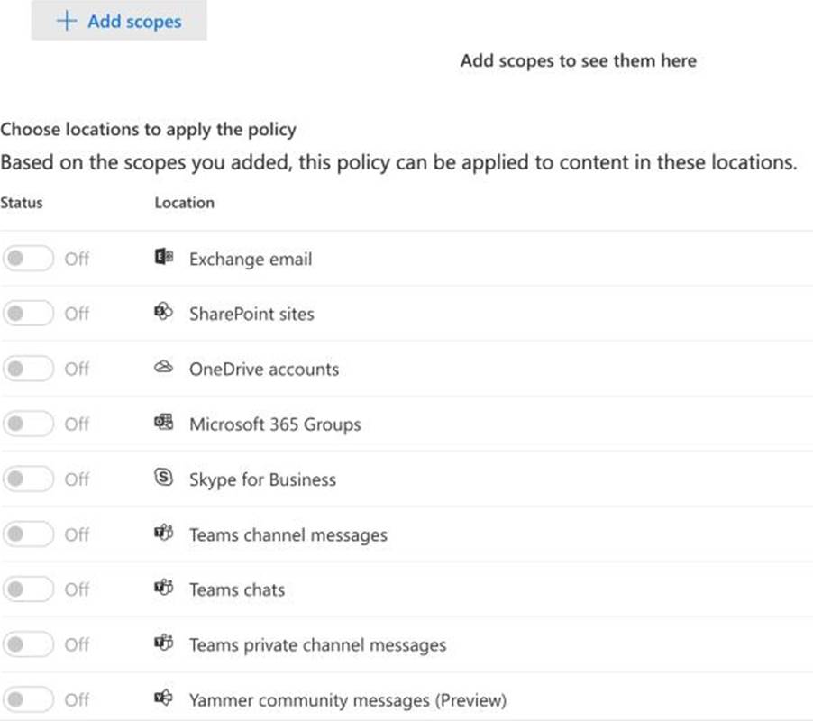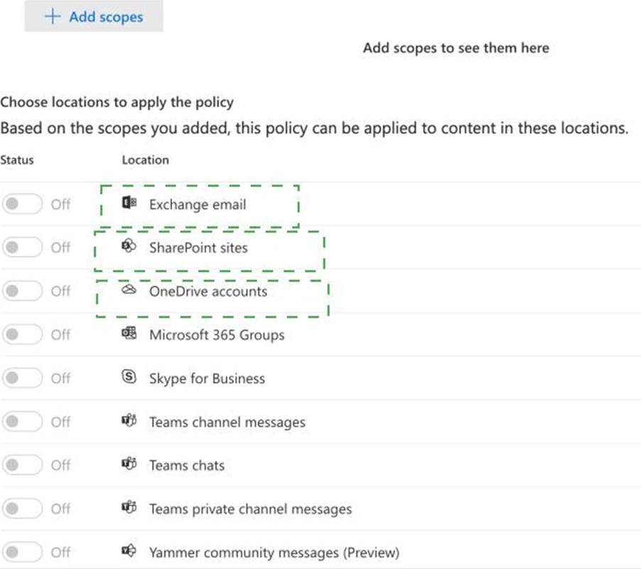 HOTSPOT You have a Microsoft 365 E5 subscription. You create an adaptive scope named Scope 1 as shown in the following exhibit. You create a retention policy named Policy1 that includes Scope1. To which three locations can you apply Policy1? To answer, select the appropriate locations in the answer area....