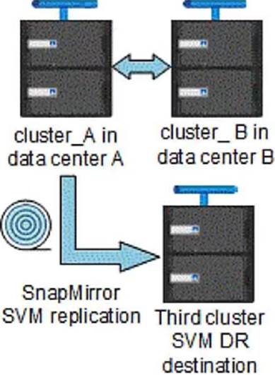 Using ONTAP 9.5, you are operating with data protection across three sites. The cluster_A and cluster_B systems require synchronous replication. The SVMs on cluster_A also require asynchronous SVM-DR replication to a third site. All replication between all sites must also replicate the SVM configuration.