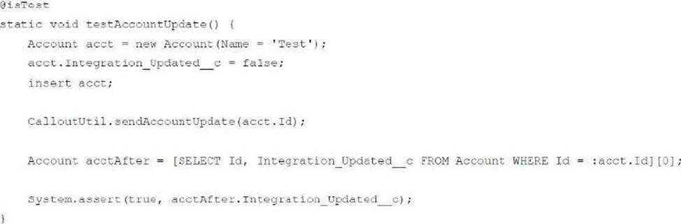 - A . Add if (‘Test.isRunningTest I)) around calloutUtil.sendAccountUpdate.