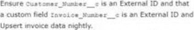 - B . Ensure Customer_Number__c is an External ID and that a custom field Invoice_Number__c is an External ID and Upsert invoice data nightly.