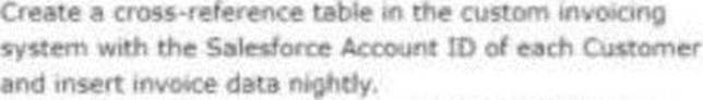 - C . Create a cross-reference table in the custom invoicing system with the Salesforce Account ID of each Customer and insert invoice data nightly.