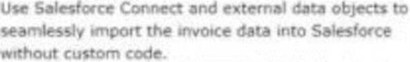 - A . Use Salesforce Connect and external data objects to seamlessly import the invoice data into Salesforce without custom code.