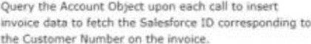 - D . Query the Account Object upon each call to insert invoice data to fetch the Salesforce ID corresponding to the Customer Number on the invoice