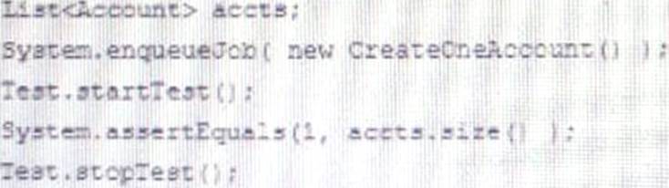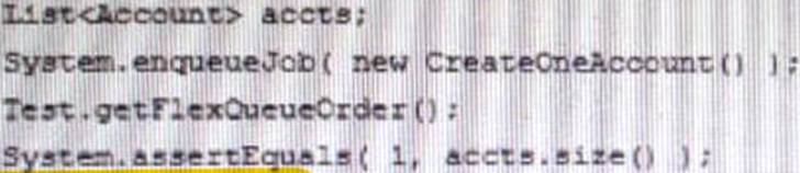 Assuming the CreateOneAccount class creates one account and implements the Queuetable interface, which syntax tests the Apex code?