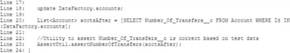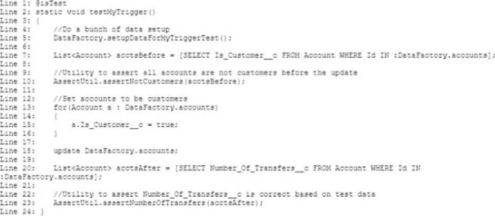 - C . Add TeststartTest() before Line 18 of the code and add Test.stopTest() after line 18 of the code.