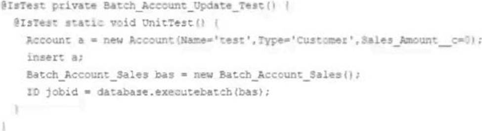 A developer has a Batch Apex process, Batch_Account_Sales, that updates the sales amount for 10,000 Accounts on a nightly basis. The Batch Apex works as designed In the sandbox. However, the developer cannot get code coverage on the Batch Apex class.