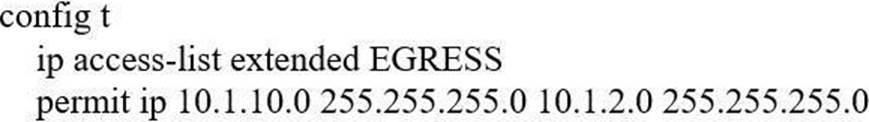 An engineer must modify the access control list EGRESS to allow all IP traffic from subnet 10.1.10.0/24 to 10.1.2.0/24. The access control list is applied in the outbound direction on router interface GigabitEthemet 0/1 .