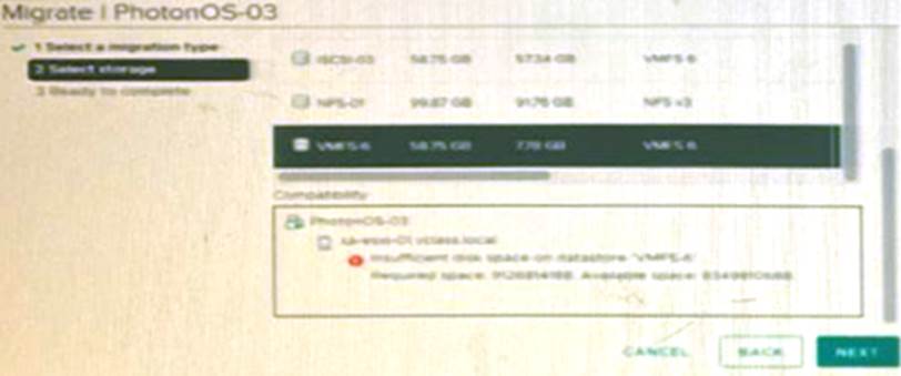 A virtual infrastructure operator needs to migrate a virtual machine (VM). Which action can the operator take to overcome the error message?A . Select a different datastore for the VM. B. Select a cluster that has access to additional storage space. C. Change the virtual disk format to Thick provision...