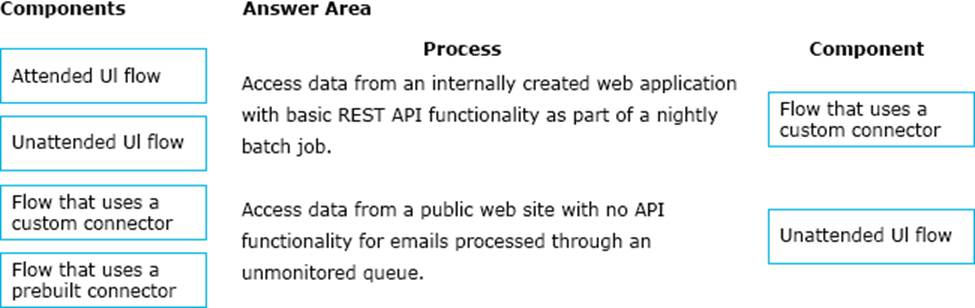 Which components should you recommend? To answer, drag the appropriate components to the correct processes. Each component may be used once, more than once, or not at all. You may need to drag the split bar between panes or scroll to view content. NOTE: Each correct selection is worth one point.