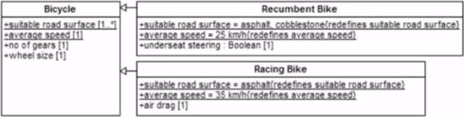 In Option C, the properties suitable road surface and average speed have been redefined in the subclasses Recumbent Bike and Racing Bike. The use of the {redefines} keyword in UML signifies that the subclass will provide its own specific values for these properties, overriding the general ones provided by the superclass Bicycle. This is the correct way to enforce that each specialization of Bicycle has a unique set of values for these attributes, as redefinition allows for the customization of inherited properties on a per-subclass basis. The use of {redefines} is specified in the UML 2.x Superstructure Specification, which describes how properties inherited from a superclass can be customized by subclasses.