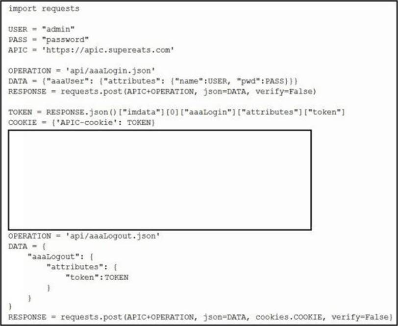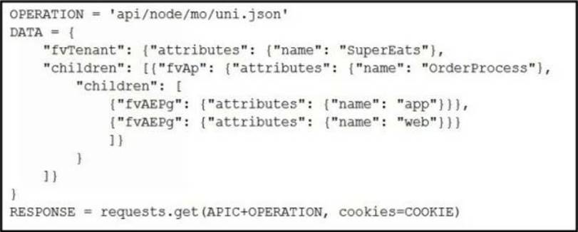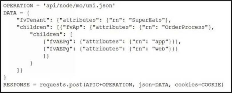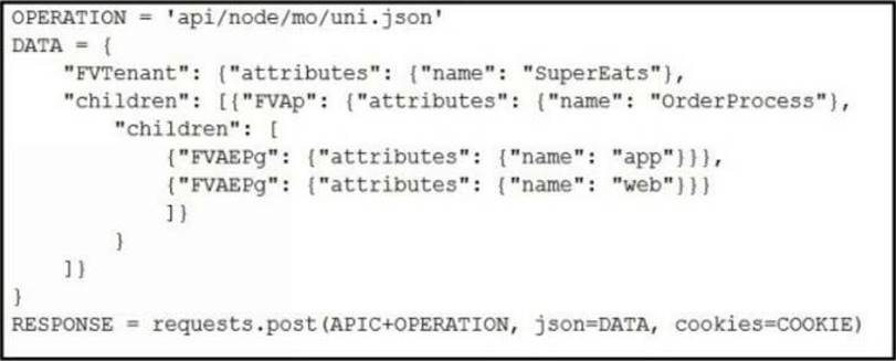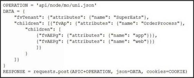 Which Python snippets create an application policy named OrderProcess that contains two application endpoint groups under Tenant SuperEats using direct calls to the ACI REST API? Assume that authentication and library imports are correct.
