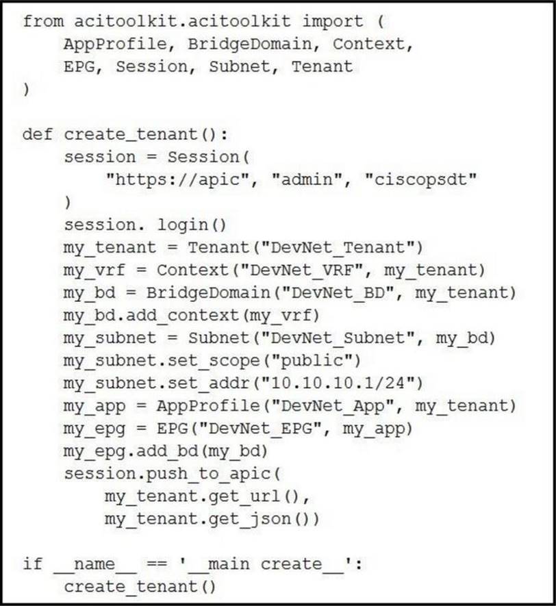 Which two actions does this Python code perform with the Cisco ACI? (Choose two.)